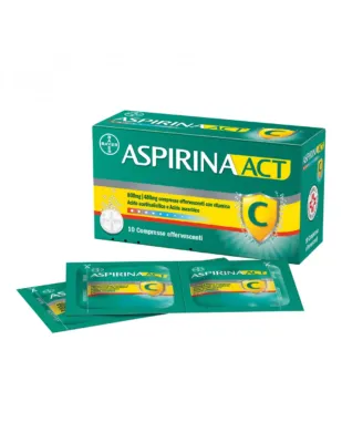 ASPIRINAACT 10 compresse effervescenti 800 mg + 480 mg con vitamina C è un farmaco da banco da automedicazione in compresse effervescenti utile per dolore e raffreddore.Contiene un dosaggio doppio rispetto alla classica ASPIRINA C.
