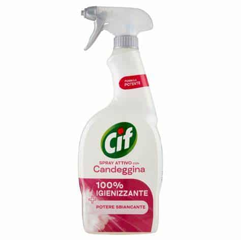 Doppia funzione Per un pulito impeccabile su tutte le superfici: per superfici verticali e per pretrattare i capi bianchi Spray: pulizia estesa e veloce su tutte le superfici Cif Duo Spray Attivo con Candeggina, grazie al suo doppio uso, ti garantisce pulito e igiene su tutte le tipologie di superfici di bagno e cucina (sanitari, lavelli, piani di lavoro). Provalo anche come pretrattante sui tessuti bianchi, per aiutarti a rimuovere le macchie*. *Testato su tessuti standard (cotone, misto poliestere/cotone). Applicato sulla macchia prima del lavaggio aiuta a rimuovere macchie come vino, caffè, succo di frutta e rossetto. Dopo aver applicato il prodotto sulla macchia, tieni il capo separato dai capi colorati per evitare eventuali scolorimenti