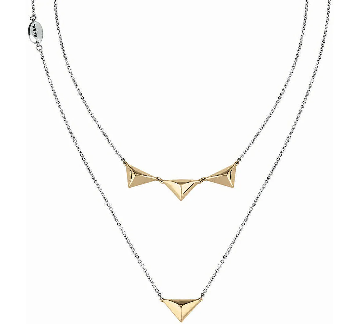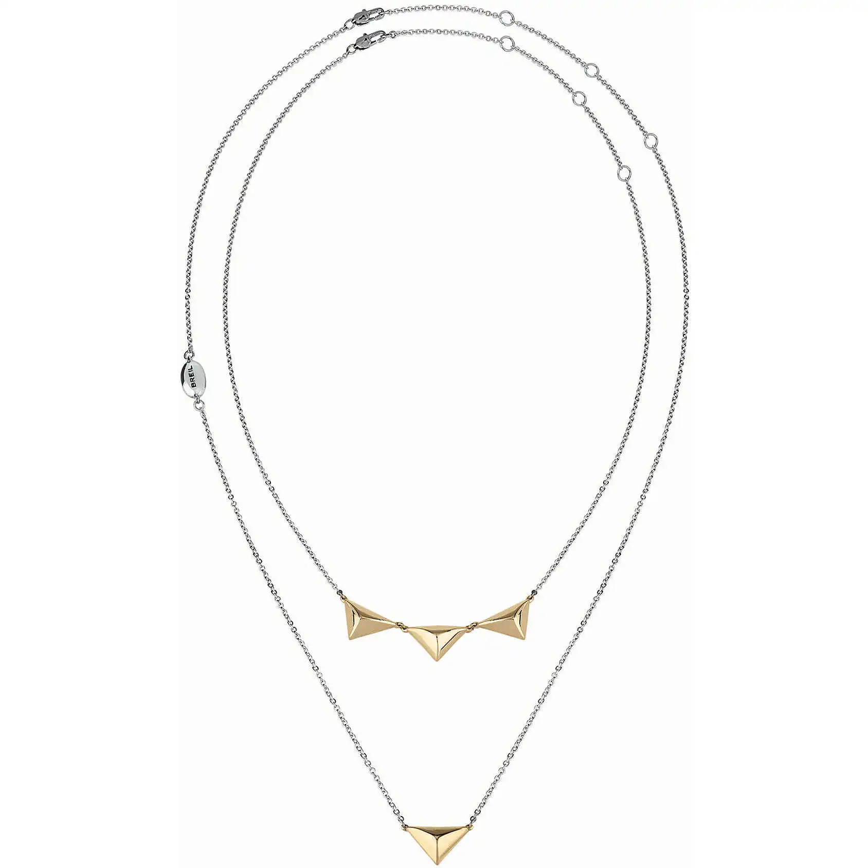 La prima catena presenta una borchia placcata oro giallo triangolare; mentre la seconda catena presenta tre borchie sempre placcate in oro giallo triangolari.