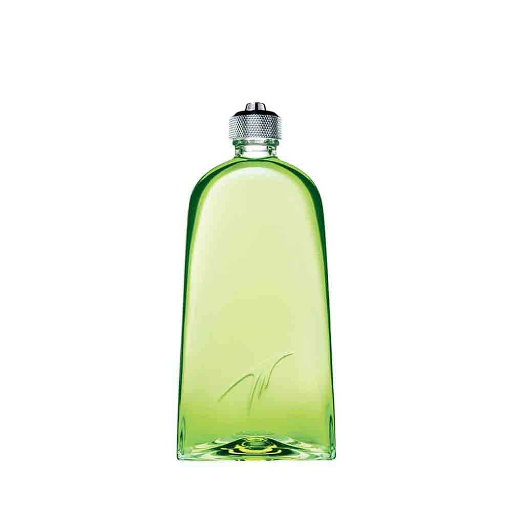 La bottiglietta trasparente, dalla lavorazione sfaccettata, lascia lo spazio al colore del contenuto, un prato verde brillante illuminato dal sole.