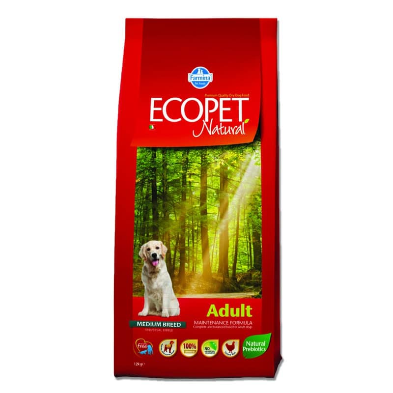 Ecopet Natural Adult Medium è disponibile in sacco da 12 Kg. Conservare a temperature inferiori ai 28°C.