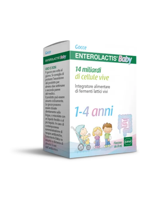 Enterolactis baby gocce è un integratore alimentare di fermenti lattici vivi, contiene 14 miliardi di cellule vive.