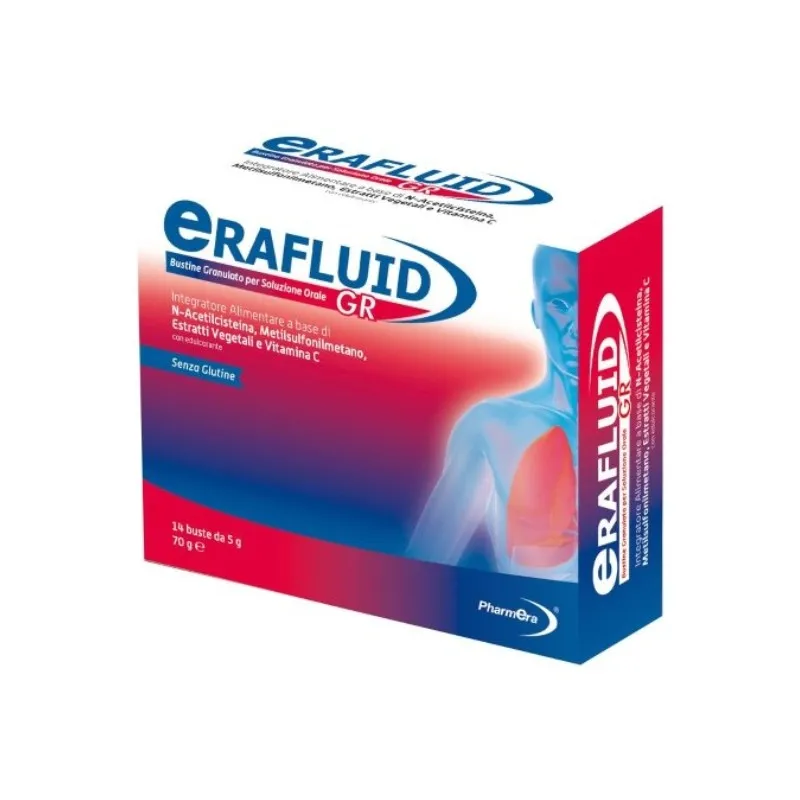 Integratore alimentare in forma di granulato per soluzione orale, utile nel trattamento delle affezioni respiratorie caratterizzate da ipersecrezione densa e vischiosa: bronchite acuta, bronchite cronica e sue riacutizzazioni. Erafluid GR é a base diN-Acetil cisteina, metil sulfonil metano ed estratti vegetali utili per l’azione fisiologica che svolgono sulle vie respiratorie.