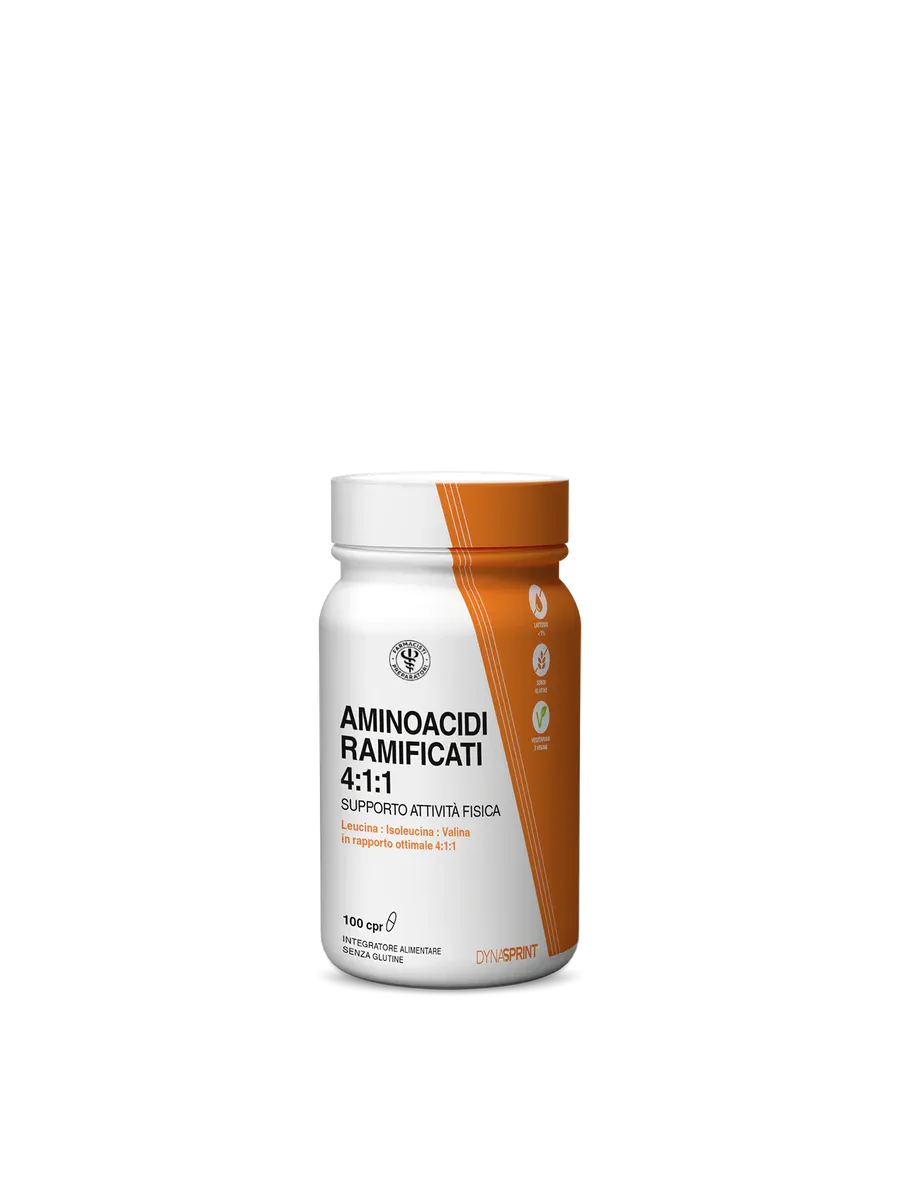 Integratore alimentare in compresse a base di aminoacidi ramificati Leucina, Isoleucina, Valina in rapporto ottimale 4:1:1 e Vitamina B6.