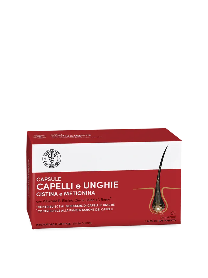 Integratore alimentare a base di Cistina e Metionina, gli aminoacidi solforati che entrano nella composizione della cheratina, sostanza base di capelli e unghie.