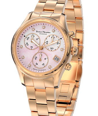 - QUADRANTE IN MADREPERLA ROSA IMPREZIOSITO DA 8 DIAMANTI NATURALI DI SINGOLO TAGLIO DA 1mm PER UN TOTALE DI 0.04 CT – LANCETTE LUMINESCENTI AL BUIO
