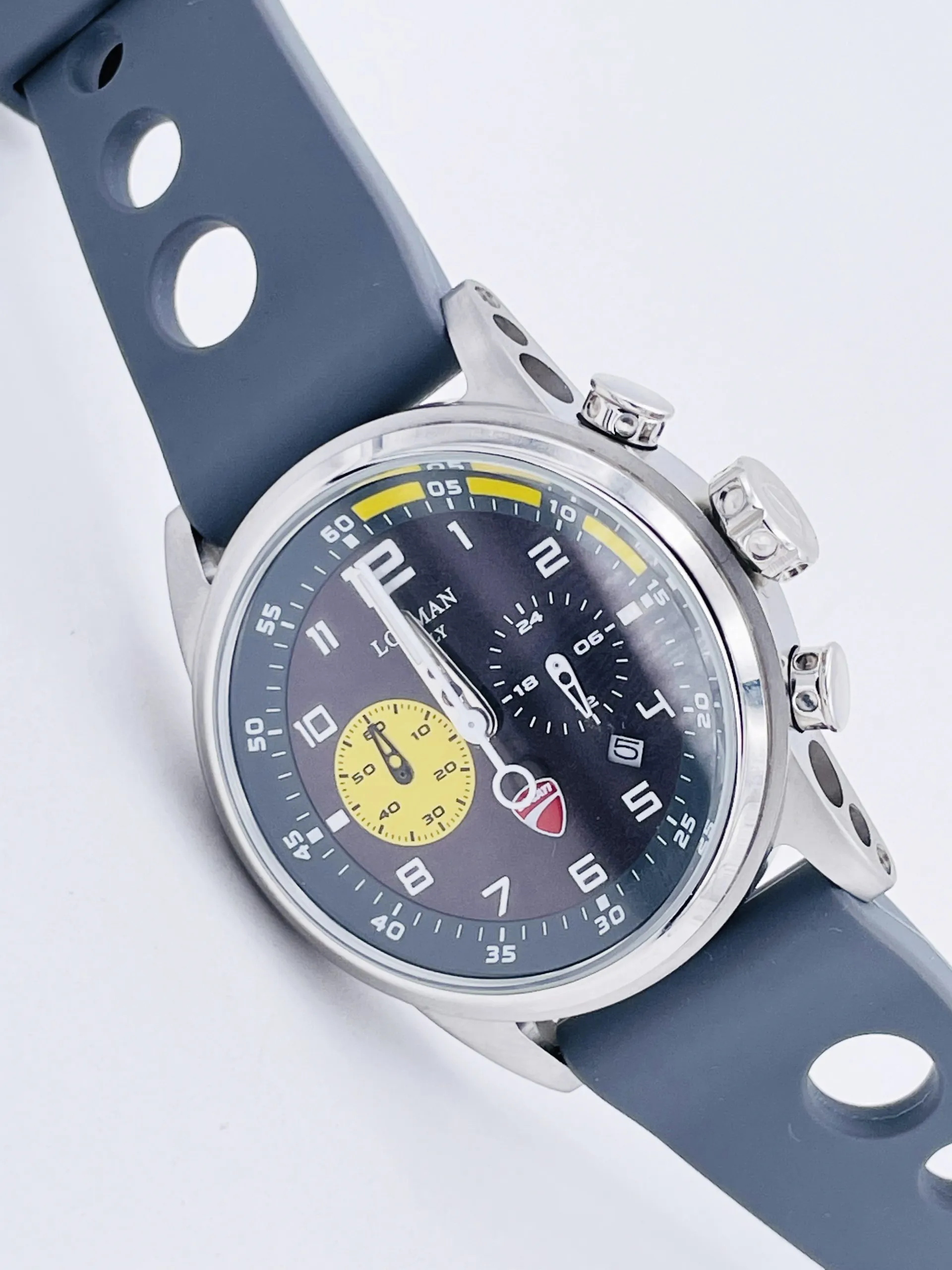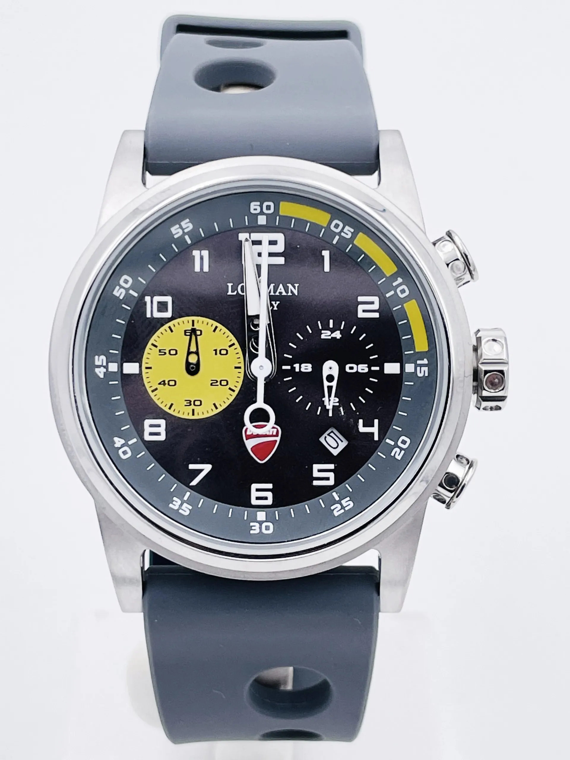 - QUADRANTE GRIGIO CON LANCETTE E NUMERI LUMINESCENTI AL BUIO, FINESTRA DEL DATARIO AD ORE “4”, SCUDETTO DUCATI AD ORE “6”