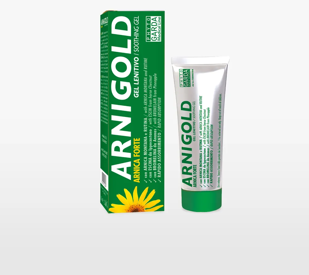 Arnigold di Phyto Garda è un gel lenitivo per la pelle a base di Arnica montana, Bromelina, Escina e Rutina.