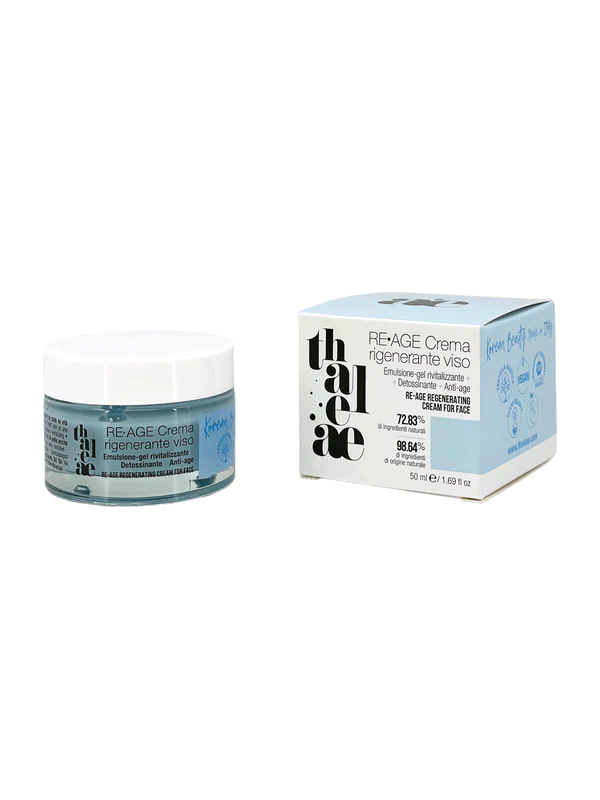 La RE•AGE Crema rigenerante viso è un’emulsione-gel di colore azzurro caratterizzata da una texture leggera con oli molto idratanti, con attivi lenitivi e rinfrescanti. Thaleæ ha creato nella Beauty Routine Koreana a cui si ispira, una crema dalla texture leggera e fondente capace di dare alla pelle “stanca” di qualsiasi età una sensazione di profonda idratazione percepibile al tatto dopo l’applicazione e di un turgore ritrovato immediato. Secondo la filosofia di Thaleæ la profumazione senza allergeni è stata creata per sostenere la percezione di freschezza e idratazione che grazie al pool unico di attivi concentrati si riesce ad ottenere. E’ ideale per le pelli giovani fino ai 40 anni e in ogni periodo dell’anno o della propria vita quando si sente che si ha bisogno di un booster di vitalità e di energia!