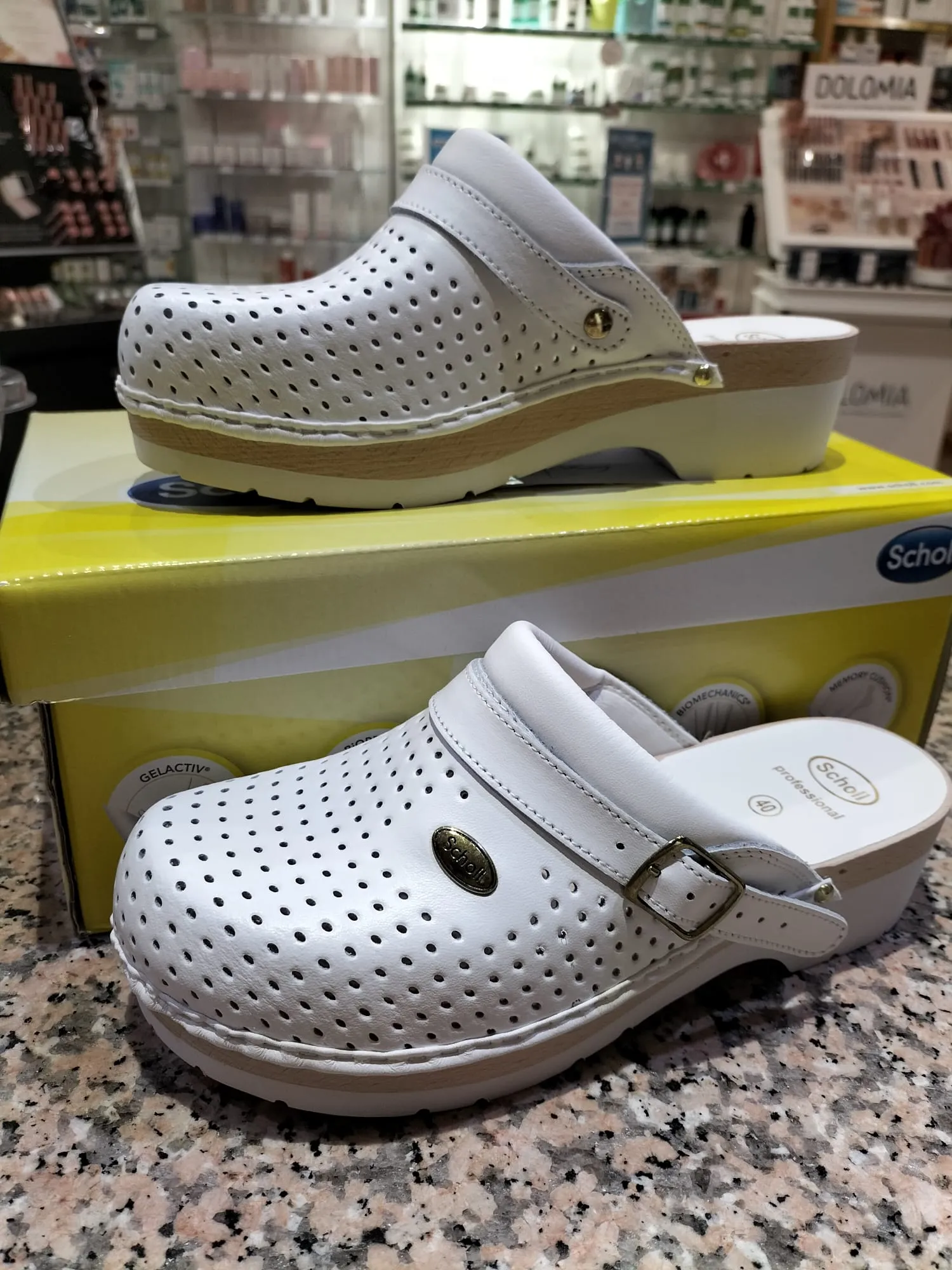 SCHOLL CLOG SUPERCOMFORT WHITE è una scarpa professionale in pelle con un plantare anatomico realizzato in legno con una calzata ampia.