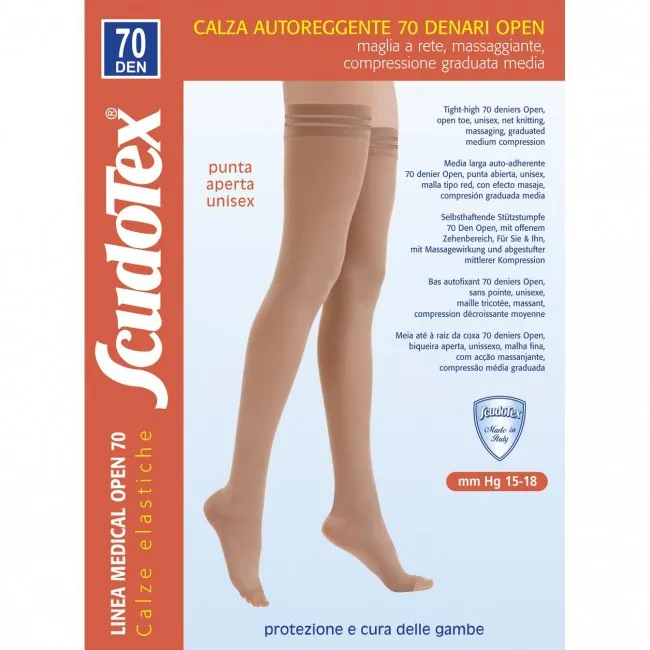 Gli autoreggenti 70 denari, cod 823 a punta aperta di Scudotex sono dotati di maglia a rete, massaggiante ed a compressione graduata media, per garantire protezione e cura delle gambe.