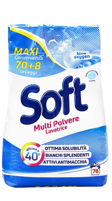 Nuova formula ottimizzata e potenziata più efficace sullo sporco. Soft polvere è un formulato realizzato mediante un processo di atomizzazione in torre che permette di ottenere un prodotto rapidamente e altamente idrosolubile anche a basse temperature, rendendone massima la resa nella rimozione dello sporco.